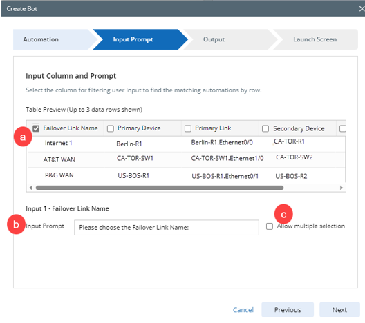 In Bot WizardPower users select Failover Link Name, Primary Device, Primary Link columns and define the input prompts.