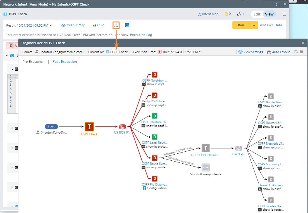 Through this tree, you can quickly check which ones of the follow-up intents in the entire multi-staging diagnosis have been executed, which ones have not been executed (highlighted in gray), which ones have alerts found during execution (highlighted in red), which ones have no alert (highlighted in green).