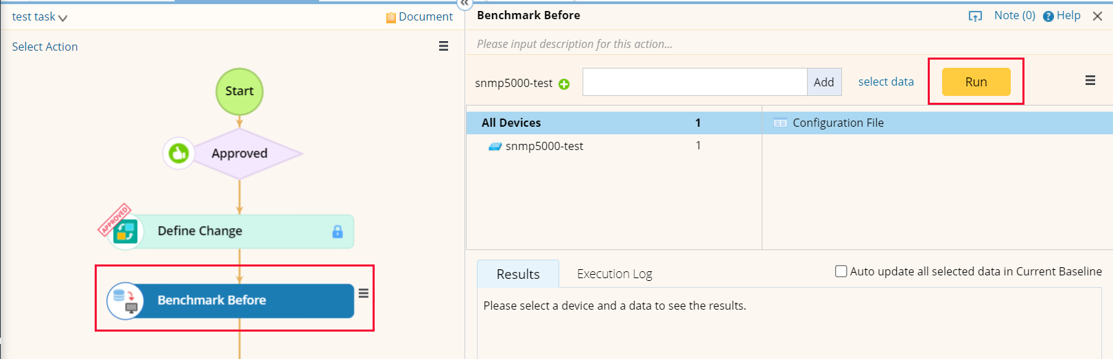 To minimize the risk of implementing a network change, it is recommended to execute a benchmark task to back up the live data of the involved devices before the change. Additionally, the data will be used as the source for comparison and validation.