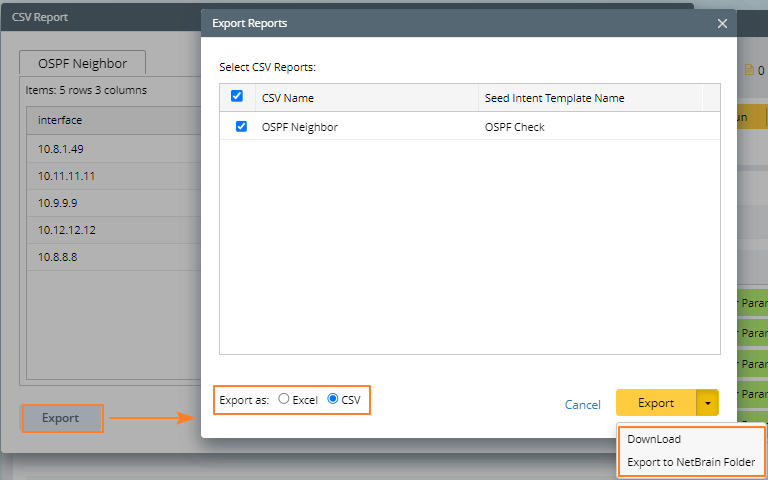 - In the Export Reports dialog, select the report you want and click Export and select CSV as export fotmat. You can directly download the report to the local folder or save the report in the NetBrain system.