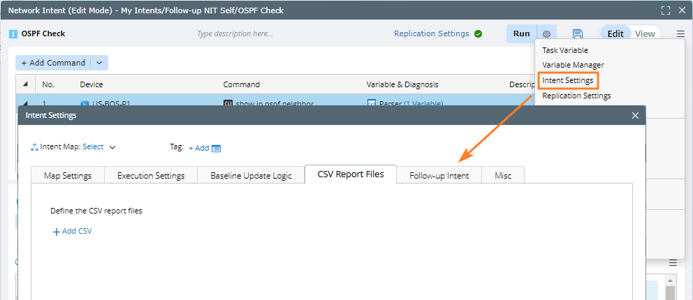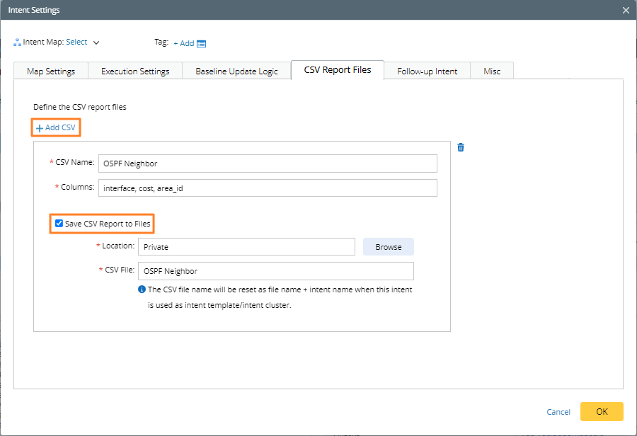 - Select the Save CSV Report to Files check box to specify the NetBrain files folder for CSV report from intent.