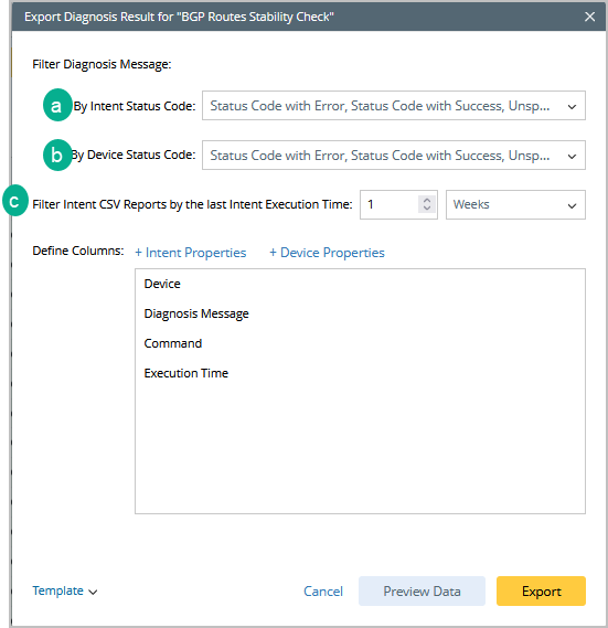 - Define Columns: Select intent properties/device property for creating the columns of the diagnosis result CSV.