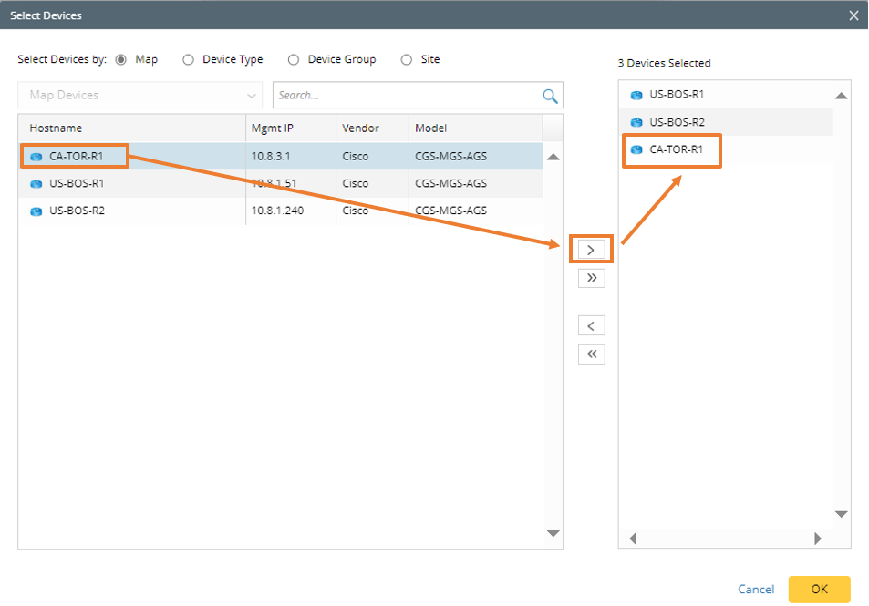 icon to display the Select Devices dialog, select a device from the left pane, then click the