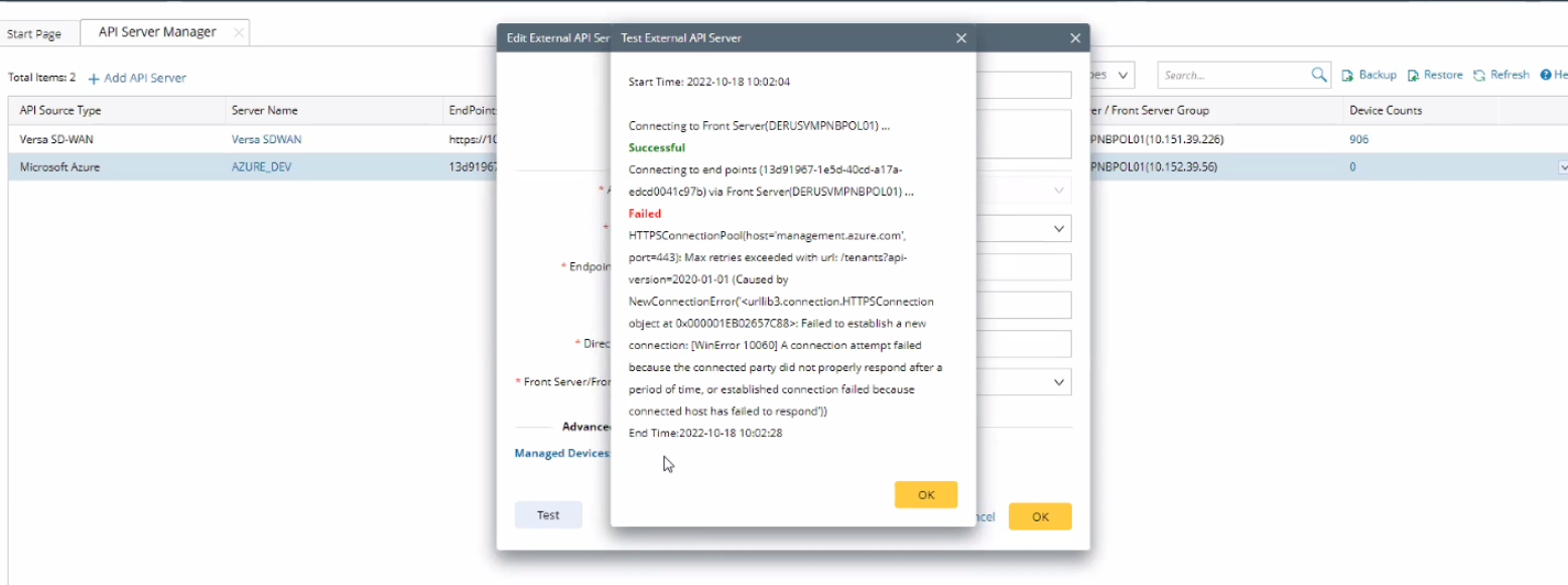 If you see the following "Failed” messages when testing the API server, it normally represents the NetBrain Front Server network access issue. The Front Server cannot reach the Microsoft Azure Server Endpoints.