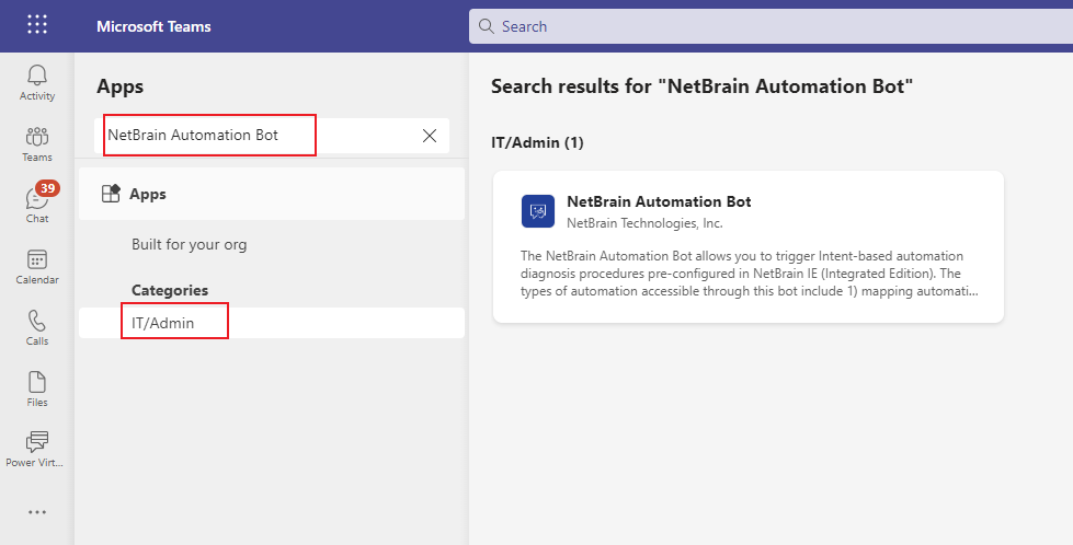 In the Apps Store, search for NetBrain Automation Bot.