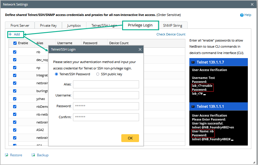 1) Click Privilege Login > Add to add the correct privilege login credentials and click OK. Repeat the operations to add all the needed credentials.