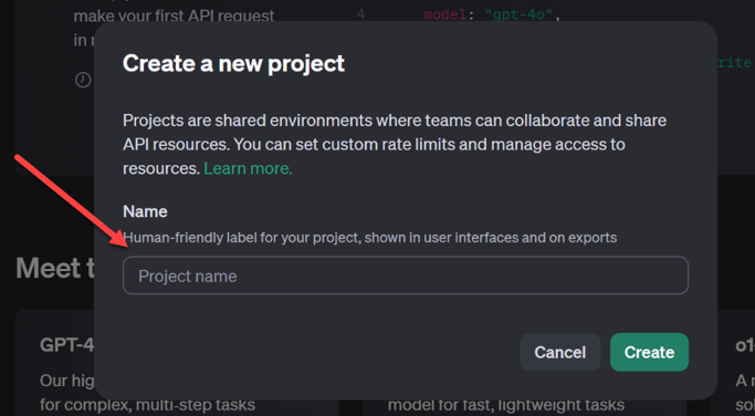 - Create a new project in the OpenAI account.