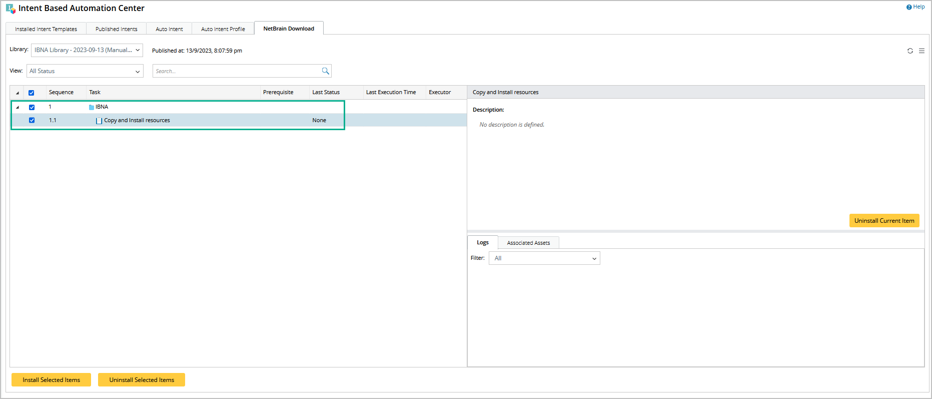 Note: Re-installation is supported to update any changes to the task. The existing assets in the task will be overwritten or skipped. |