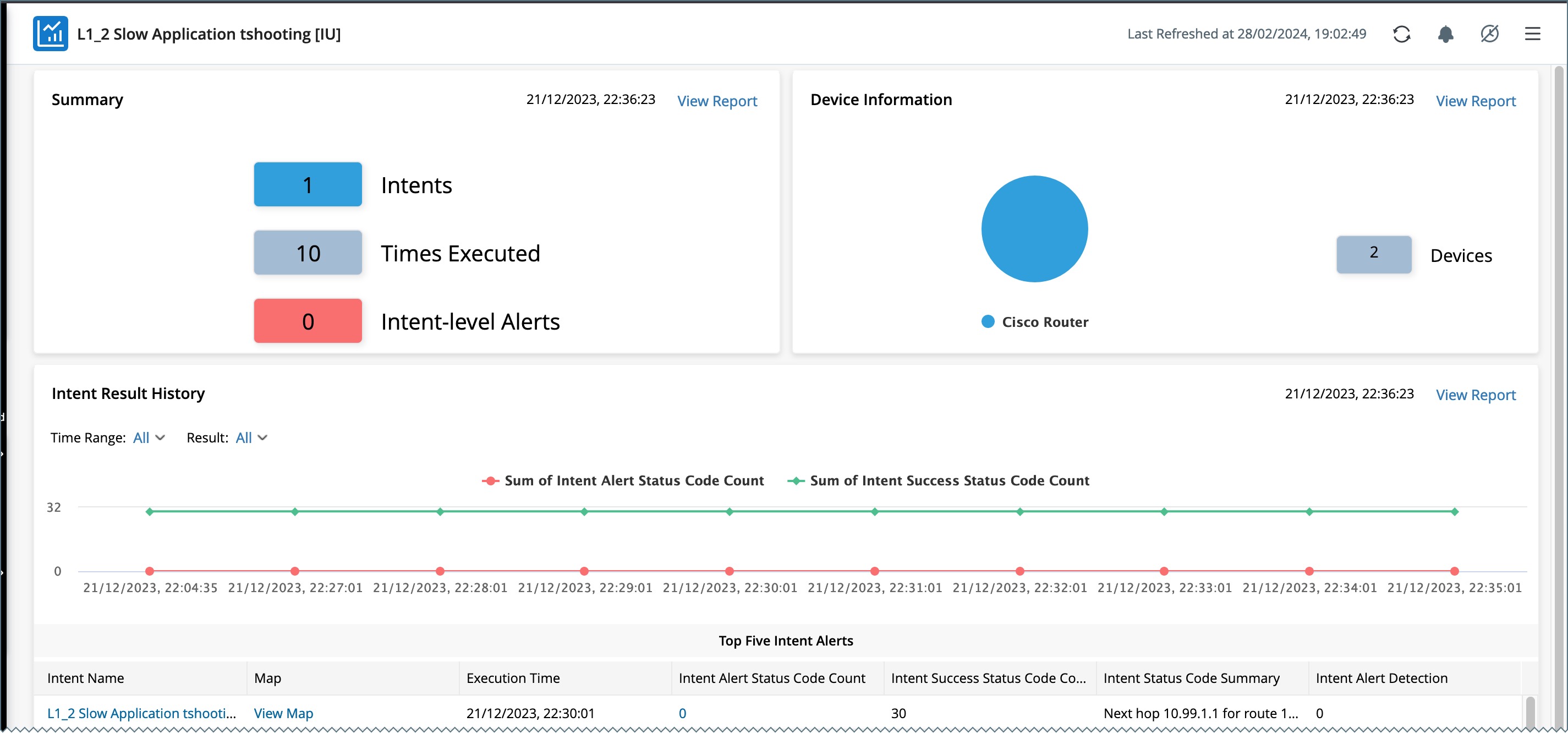 Example: There is a slow application issue in network. Create an Intent to troubleshoot this transient problem, then execute it every 15 minutes for one week. The Intent Dashboard is created to display the results of each execution to and help navigate the time when the problem is found. The Intent Dashboard will be auto-refreshed to update the execution result of the intent and provide an alert notification by email.