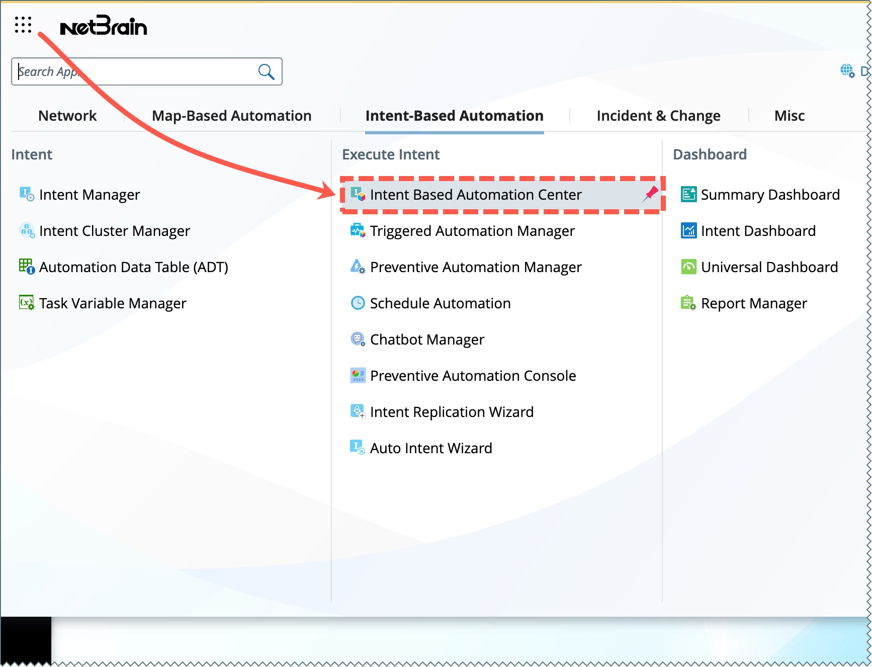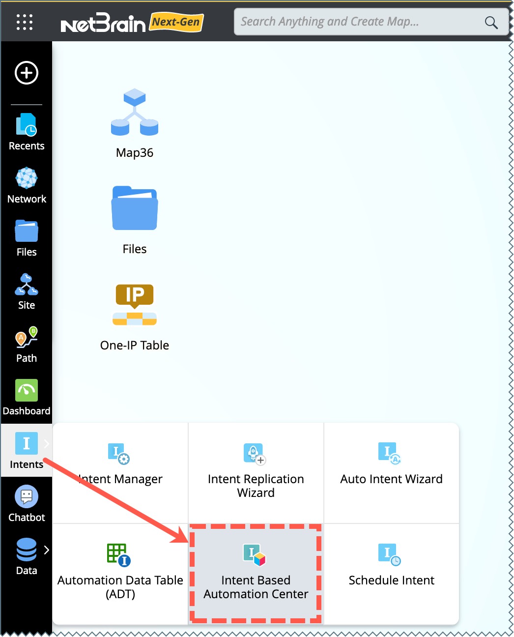 In NetBrain, you can define a Network Intent Template (NIT) for an intent to clone it across the network system. Accordingly, Intent Based Automation Center (IBA center) is provided in the system, serving as a central console for carrying out various operations such as decoding and installing intent templates, enabling NIT/ADT for Auto Intent, managing assets in NetBrain Download, and managing published intents.
