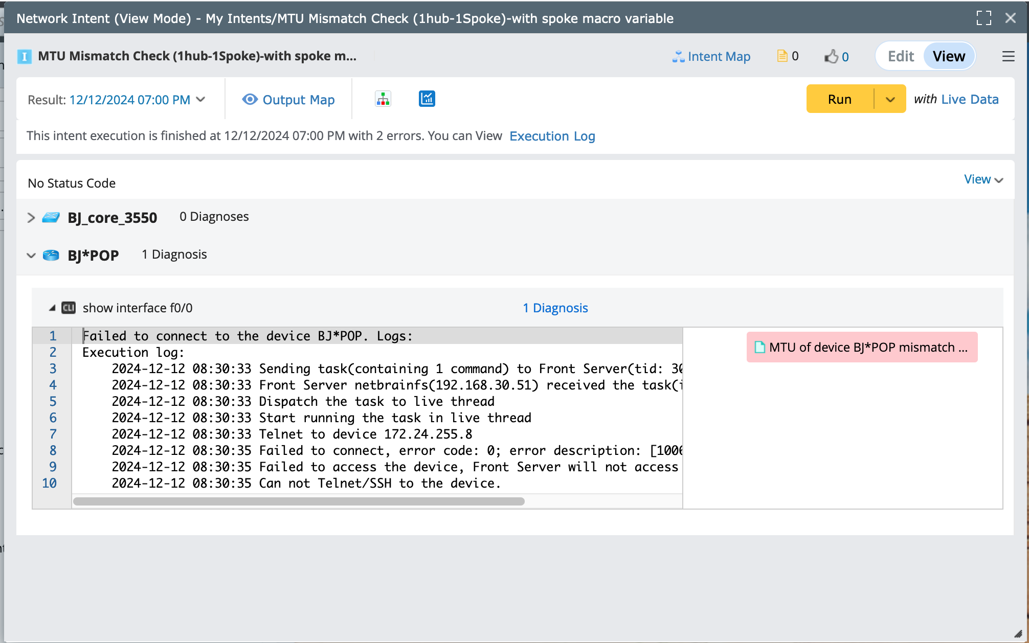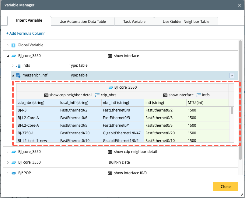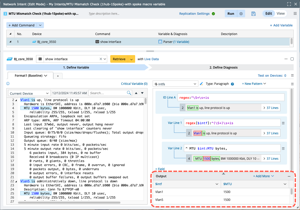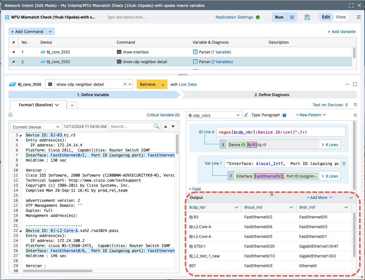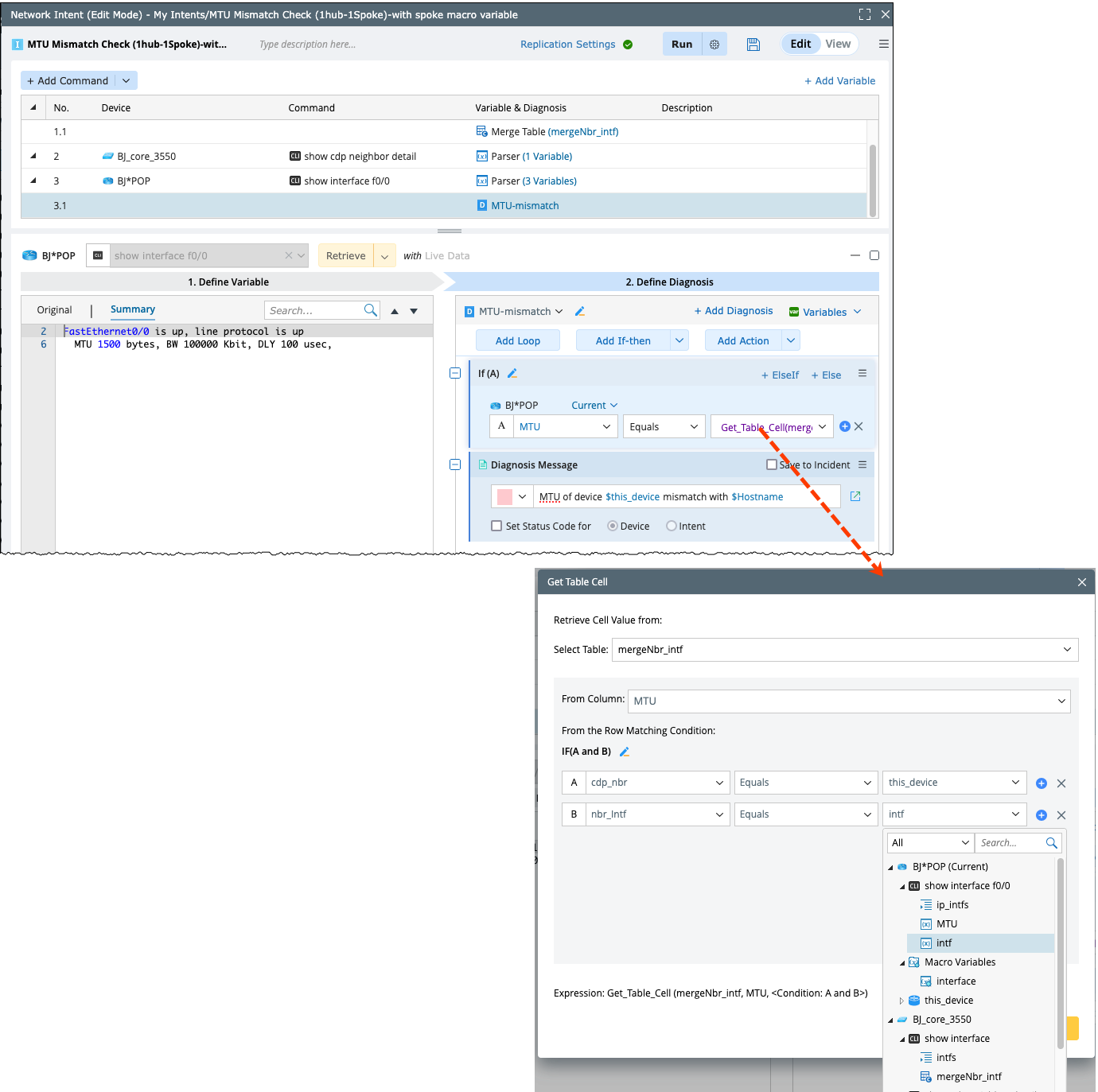 Set the macro variable for this device interface, and the command will be “show interface $intf”. Use it to get all neighbor interfaces and MTU values.And use this macro variable to define a diagnosis to compare the MTU of this device and device “BJ_core3550”.