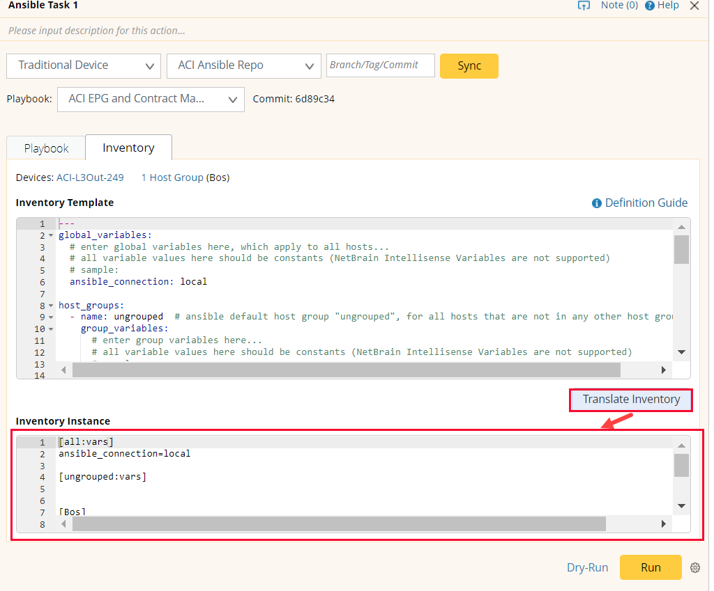 Define an inventory template in the text field and click Translate Inventory. Multiple hosts will be generated in the Inventory Instance field accordingly. After the inventory instance is generated, users can still modify the parameters in the Inventory Instance editor based on their specific project needs.