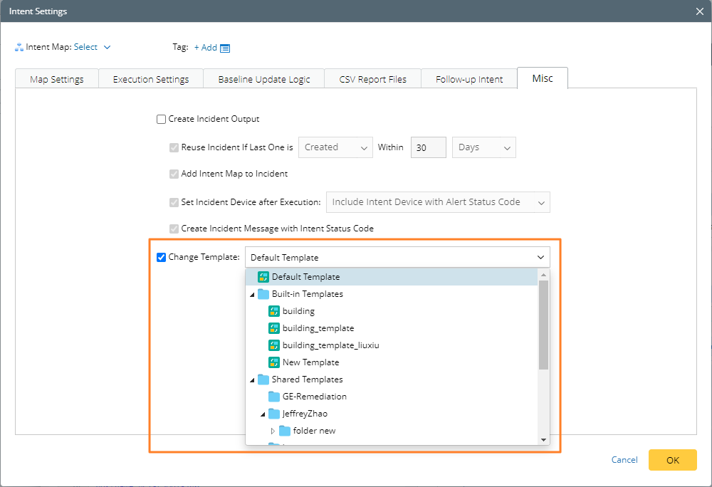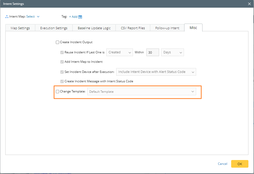- In the Misc tab on the Network Settings, select the Change Template check box and then choose a template. The default template is selected automatically.