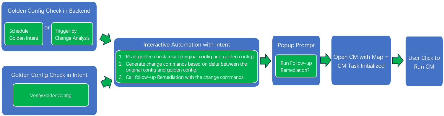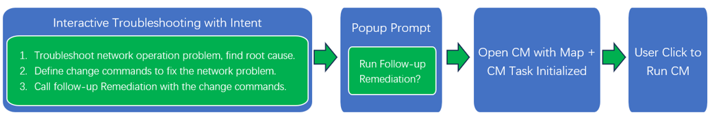 After the NI execution, users will be prompted to determine if the follow-up remediation is needed. If users agree, the corresponding change task is generated based on the device, config change commands, and the CM template calculated in NI. This allows users to execute the change task and quickly resolve the network problem. For example: