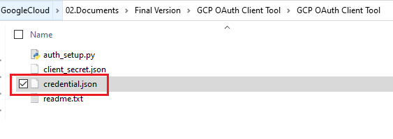 - Rename the OAuth credential JSON file as client_secret.json, downloaded in step 4 of section 1.5.2 Create OAuth Client & Credential, and move it to the same folder with auth_setup.py in the GCP OAuth Client Tool folder.