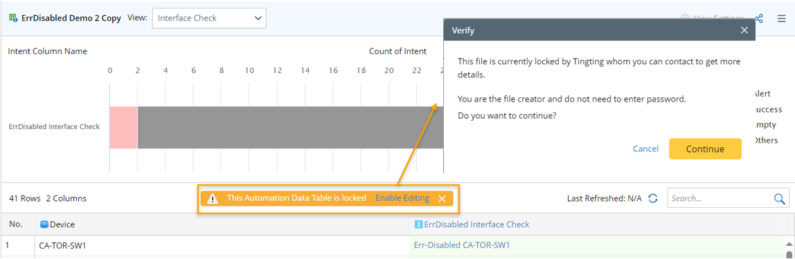 ADT view is locked by locking the ADT, which means that if the original ADT is locked, all its associated views will be locked in the same manner. If ADT is locked by one user, other users without corresponding privilege can only switched views of the ADT but cannot open any view of the ADT. when the original ADT is locked, a message "The Automation Data Table is locked Enable Editing" will appear on the associated ADT view. You can click Enable Editing in the message to try to unlock the view.