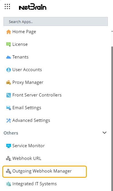 Outgoing webhook can be created and used in NI definition to push the data and execution results in NI to third-party application, connecting NetBrain to third-party system. Outgoing Webhook Manager is central place for creating and managing outgoing webhooks in the domain. After outgoing webhook is defined, in NI execution, you can use Webhook Call to send alerts to external ticket system. For more information, see Call Webhook API.