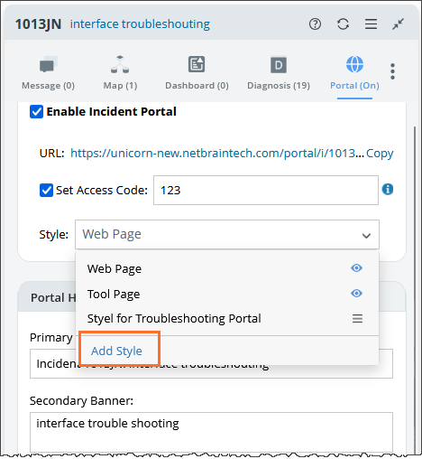 Portal styles can be selected in the Portal pane of a web incident. New portal styles can also be added.