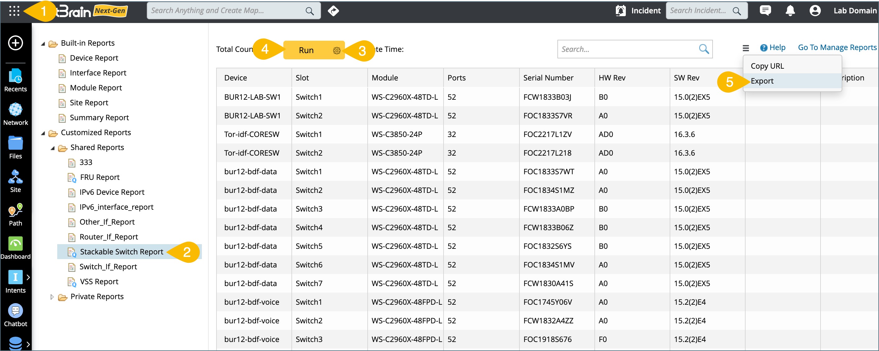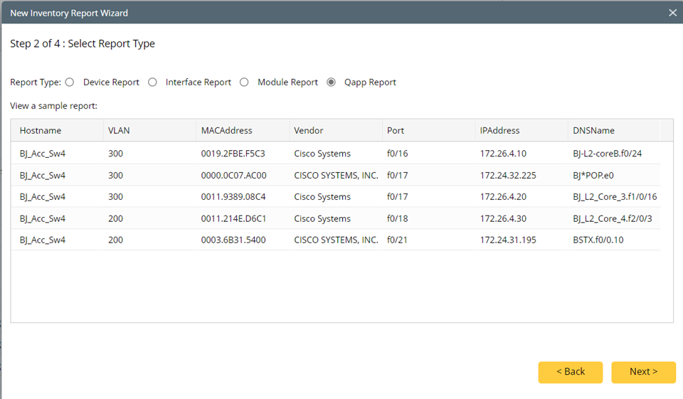 Each Qapp Report must be bound with a Qapp file with CSV output. By default, there are three built-in Qapps for generating the inventory reports as mentioned above. You can also write your own Qapp to get a customized inventory report. See Creating a Qapp to Export Network Data to Local CSV File for more details.