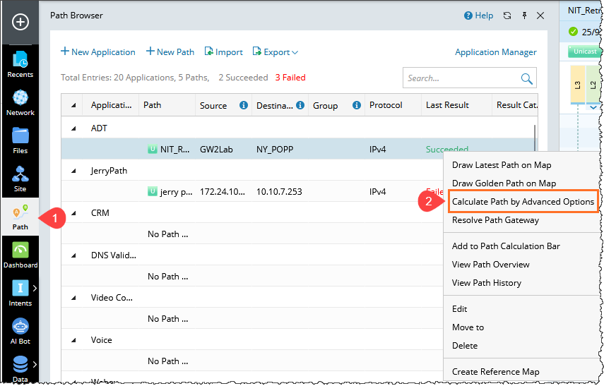 To select the path for recalculation, right-click the target path entry and select Calculate Path by Advanced Options from the drop-down menu.