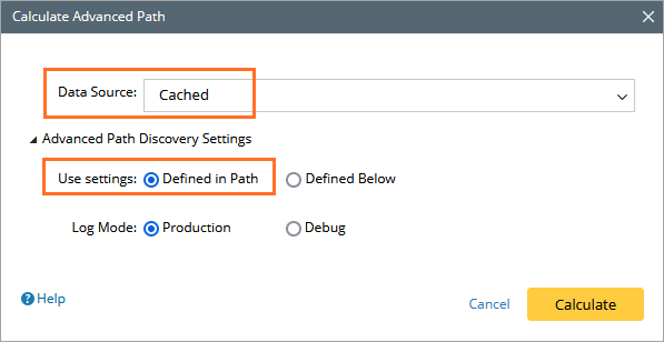 The Calculate Advanced Path dialog appears within the Path Browser and is used to calculate previously saved network paths. You can select Data Source and what settings are used for calculation. See more details in Path Settings.