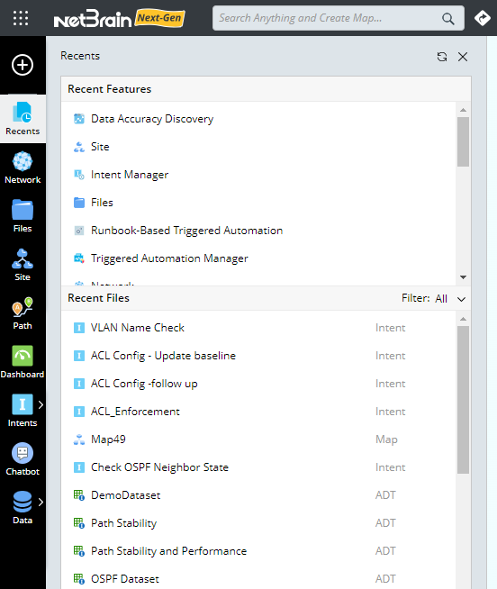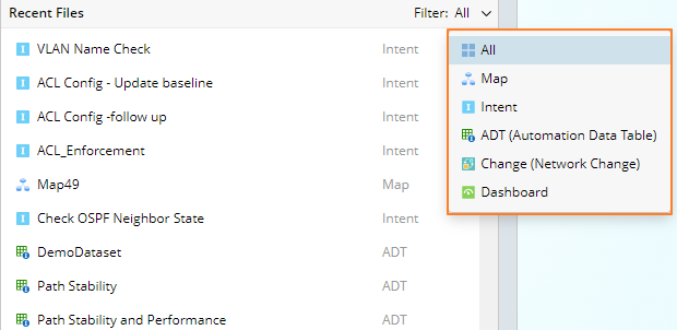 Recent files can be filtered by type, and by default, all recent files are displayed.
