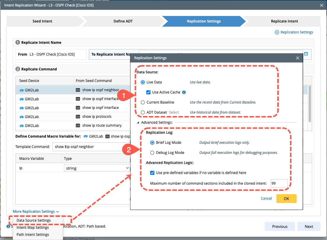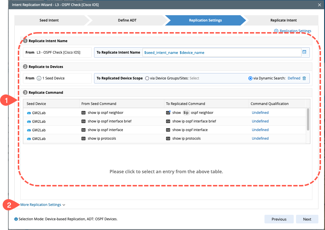 Intent Replication Logic Settings: Define the replicated intent name, target device qualification, and command qualification.