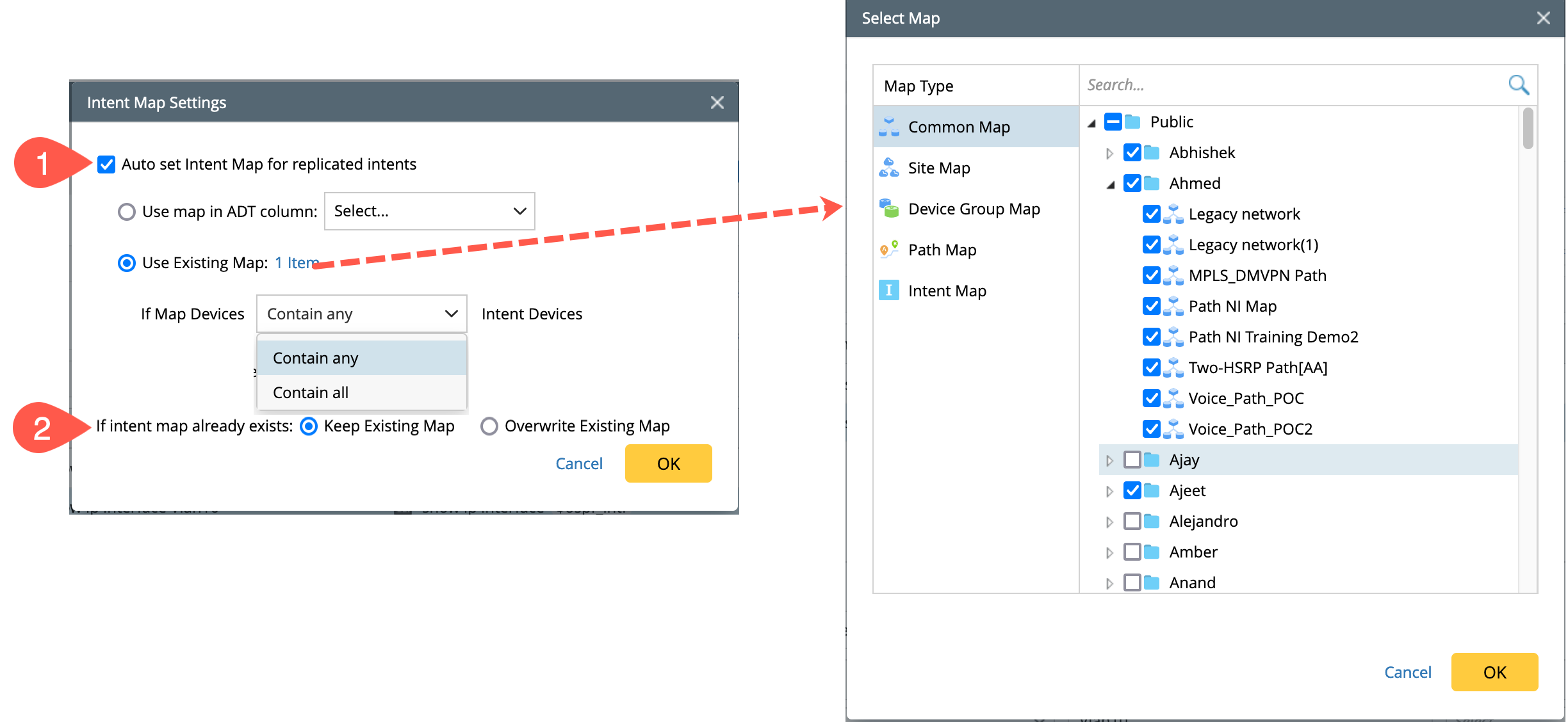 If Map Devices: Select either Contain any or Contain all. This setting decides which Map will be related to the ADT Intent by defining the inclusiveness relationship between Map devices and Intent devices. The logic is as follows: