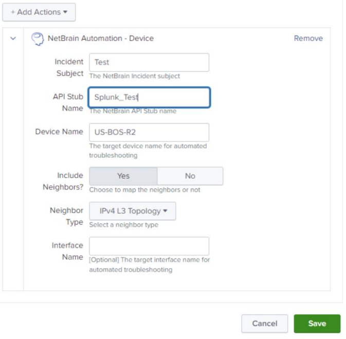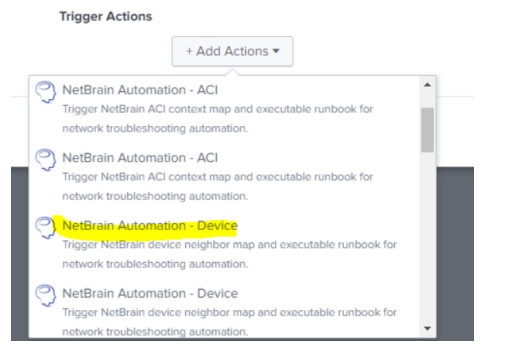 - Click Add Actions and then you will see a list of supported automations. Select NetBrain Automation - Device, which is the type of map that is to be created here.