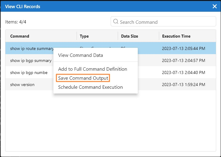 - In the View CLI Records dialog, right-click the target command and click Save Command Output.