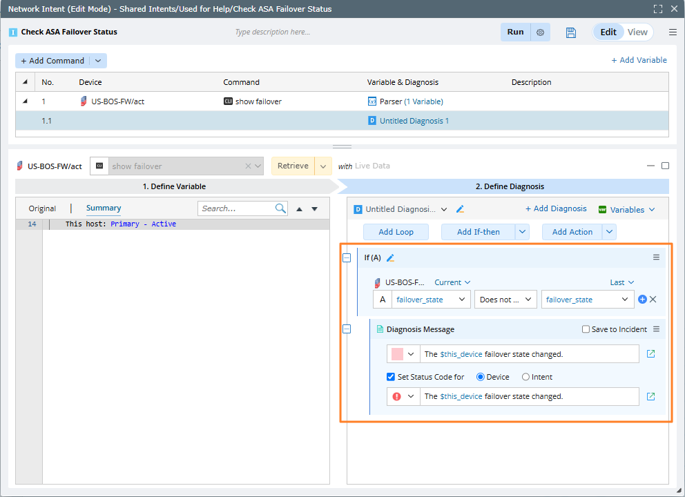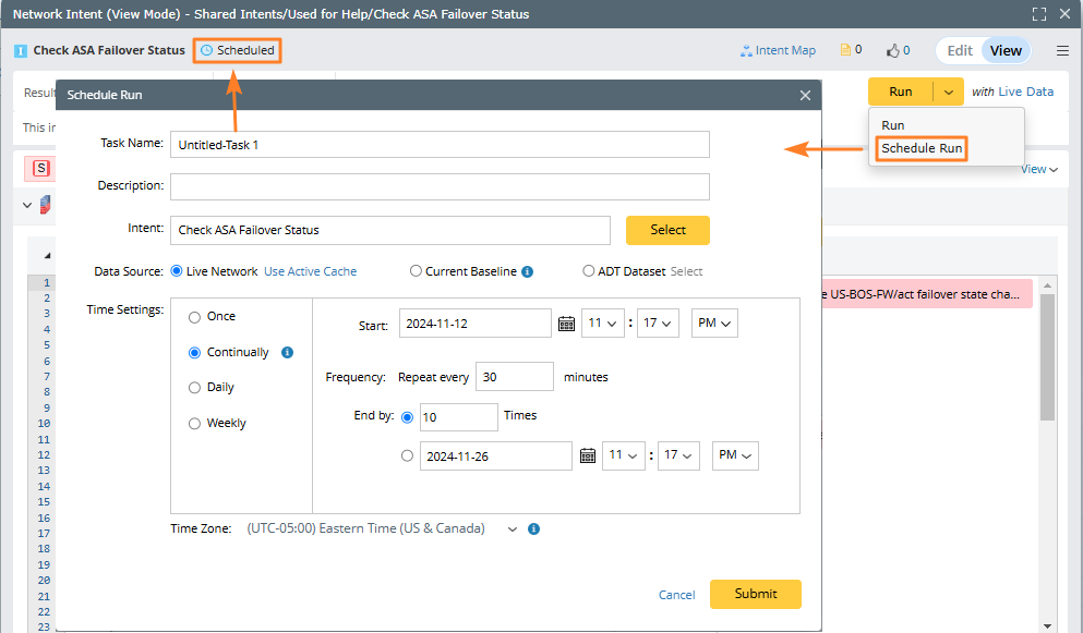 Complete the following steps to schedule an intent to verify the impact of network change, for example, monitor ASA failover status.