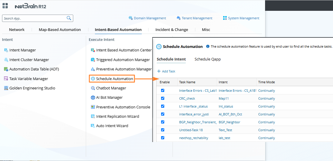 Information Note: You can also manage the scheduled intent by navigating to the Domain Management page > Schedule Task > Schedule Intent.