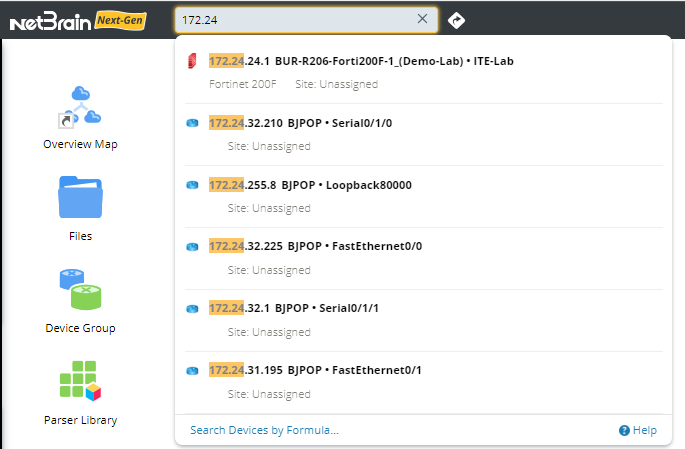 In NetBrain system, your entire network becomes a searchable database, and you can search for a device by using one of the following search terms: