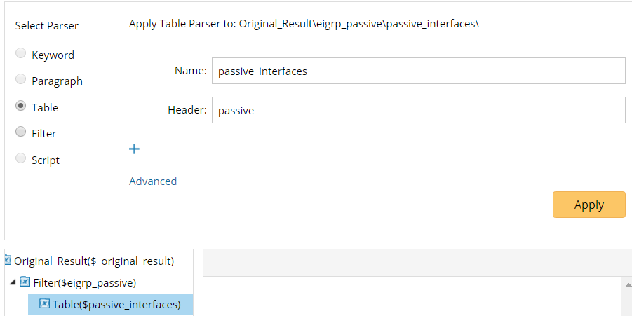 - Click Apply and a node Table($passive_interfaces) is added under the node Filter($eigrp_passive).