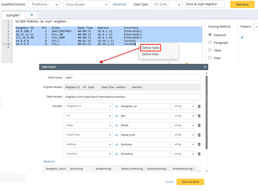 Example: Use the Table method to parse the OSPF neighbors of a device.