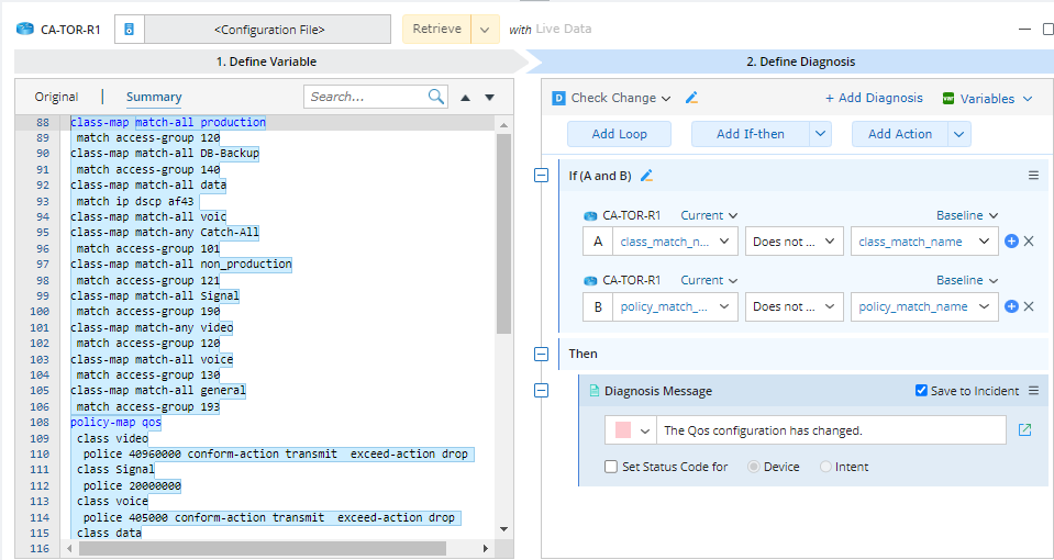 - Define diagnosis to check configuration change, and select the Save to Incident check box to save the diagnosis message to the incident. Moreover, the diagnosis message can also be saved to the incident triggered by TAF.