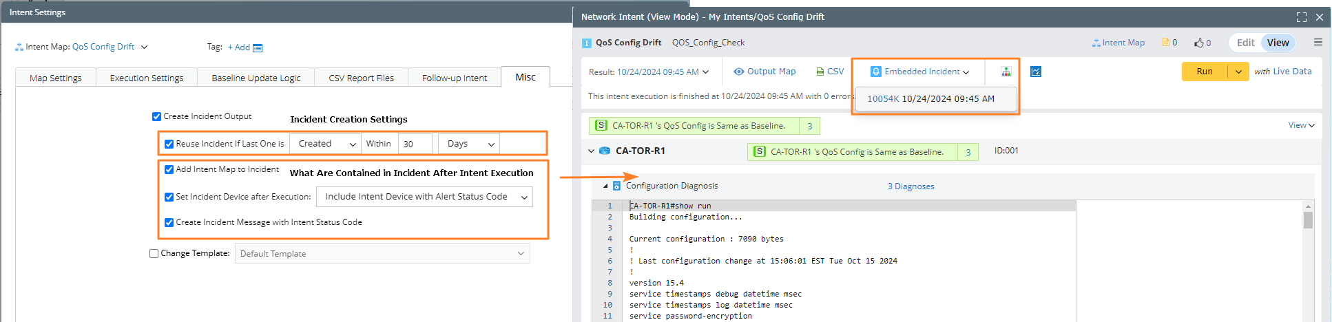 - Long-term intent executions – compliance intent or published intents may be executed after the network change, and the critical findings are documented inside the intent’s incident so that users can review this from within intent.