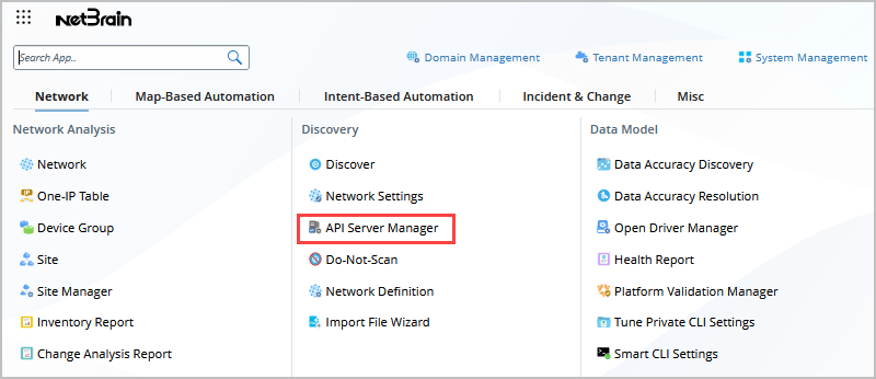 in your NetBrain desktop and select API Server Manager from the drop-down menu.