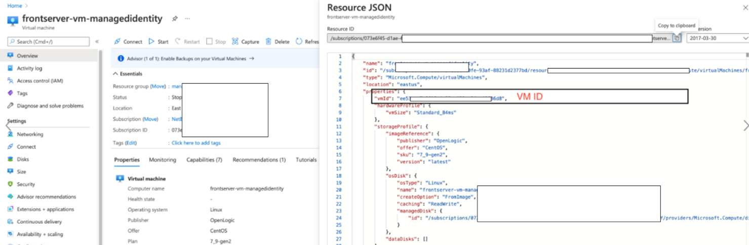 - Endpoint (Client/VM ID): copy/paste the VM ID value from the JSON format data in Azure Virtual Machine (VM) portal.
