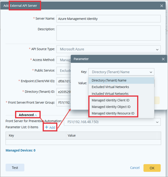 - Front Server/Front Server Group: select one front server VM with managed identity to access Azure.