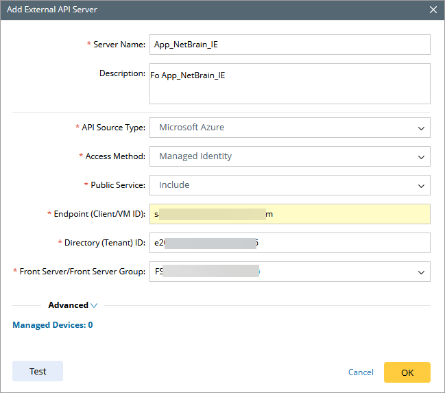 - Management Identity Client ID/Object ID/Resource ID: In the Advanced settings, you can specify which VM management identity will be used for NetBrain IE discovery.