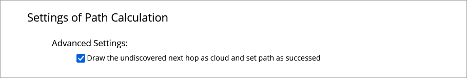 This setting allows the system to draw an undiscovered next-hop device as a cloud icon and mark the path as successful during Layer 3 path calculation. It is intended for scenarios where certain devices are not managed or reachable by the customer but are still involved in the path calculation. Such paths are expected to be considered successfully calculated, with the unmanaged or unreachable devices displayed as clouds.