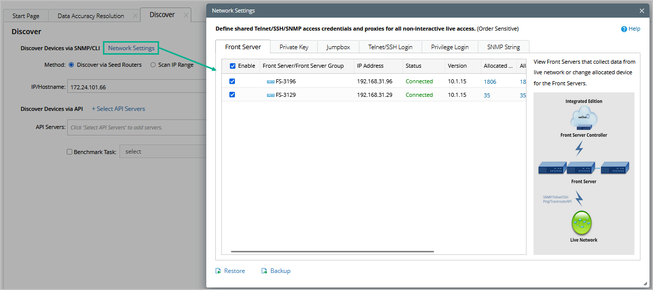 - On the Discover tab, click Network Settings to add the matched Telnet/SSH login credentials.