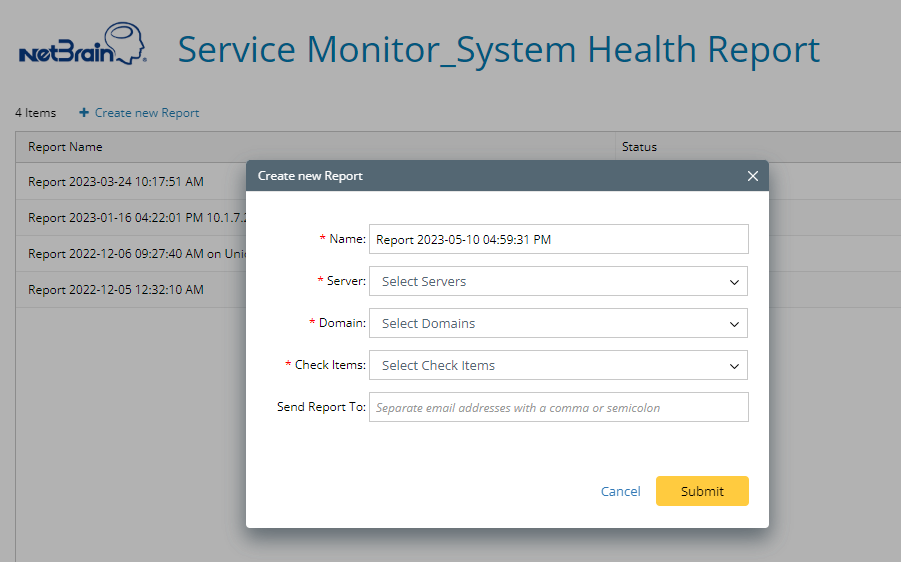 Support Health Report aims to check the health status of NetBrain systems online/offline so that system improvements can be made promptly according to the report.