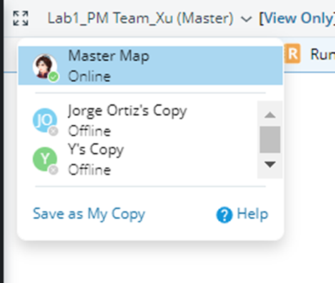 The master map and its personal copies are organized in the drop-down list at the upper-left corner of the map. The master map is always at the top of the list. Its personal copies are listed below with the name of the creator of the personal copy displayed.