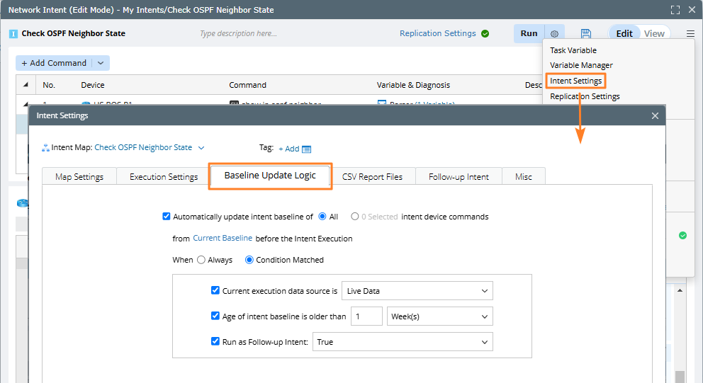 You have to compare the current data with the previous data while using intent for network assessment analysis. And you can define these settings under the Execution Settings tab of the Intent Settings, allowing you to automatically update the intent baseline as follows: