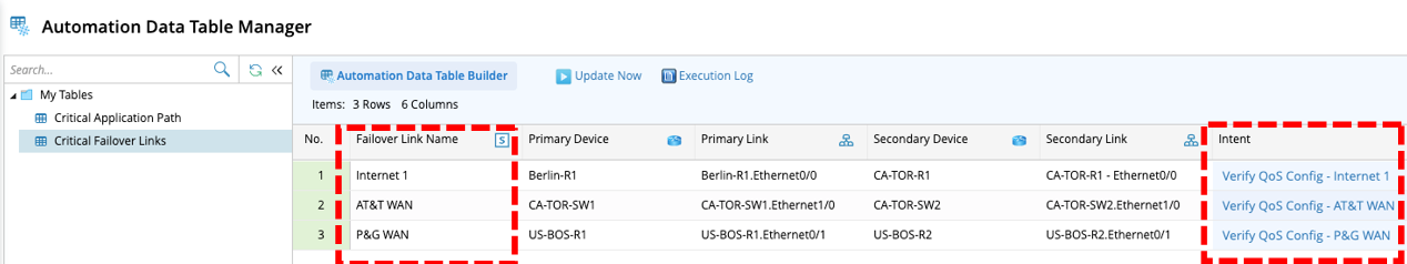 Automation Data Table(ADT) provides a flexible way to organize and extend the critical network assets and their associated intent and map. The ADT node needs end user to provide value to match which row of associated intent should be executed.