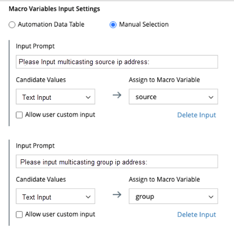 - When the network intent selected in step 3 has Macro Variables, you need to define Macro Variable Inputs Settings. End user's input can be passed to a Macro Variable through Manual Selection or Automation Data Table.