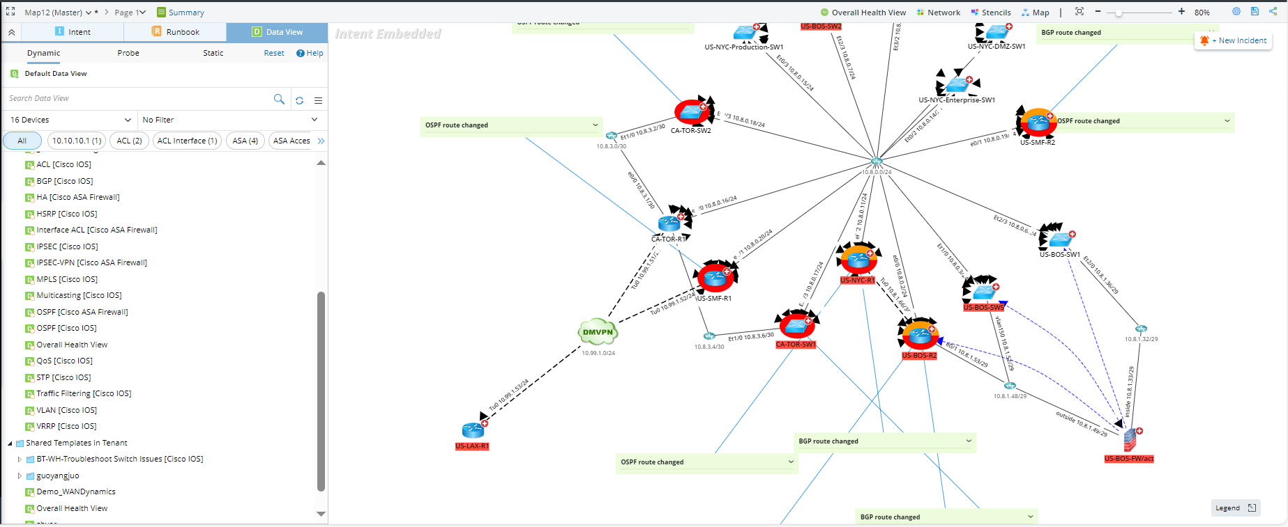 For example, with access to a Data View Template, users could highlight all routing protocols and create alerts wherever BGP is not configured. A user could also overlay QoS policies per device and drill down to each interface to see what traffic is being matched and where. A frequently used built-in DVT is the General Health Monitoring, which shows the performance data of a device, such as CPU and memory and the link utilization.