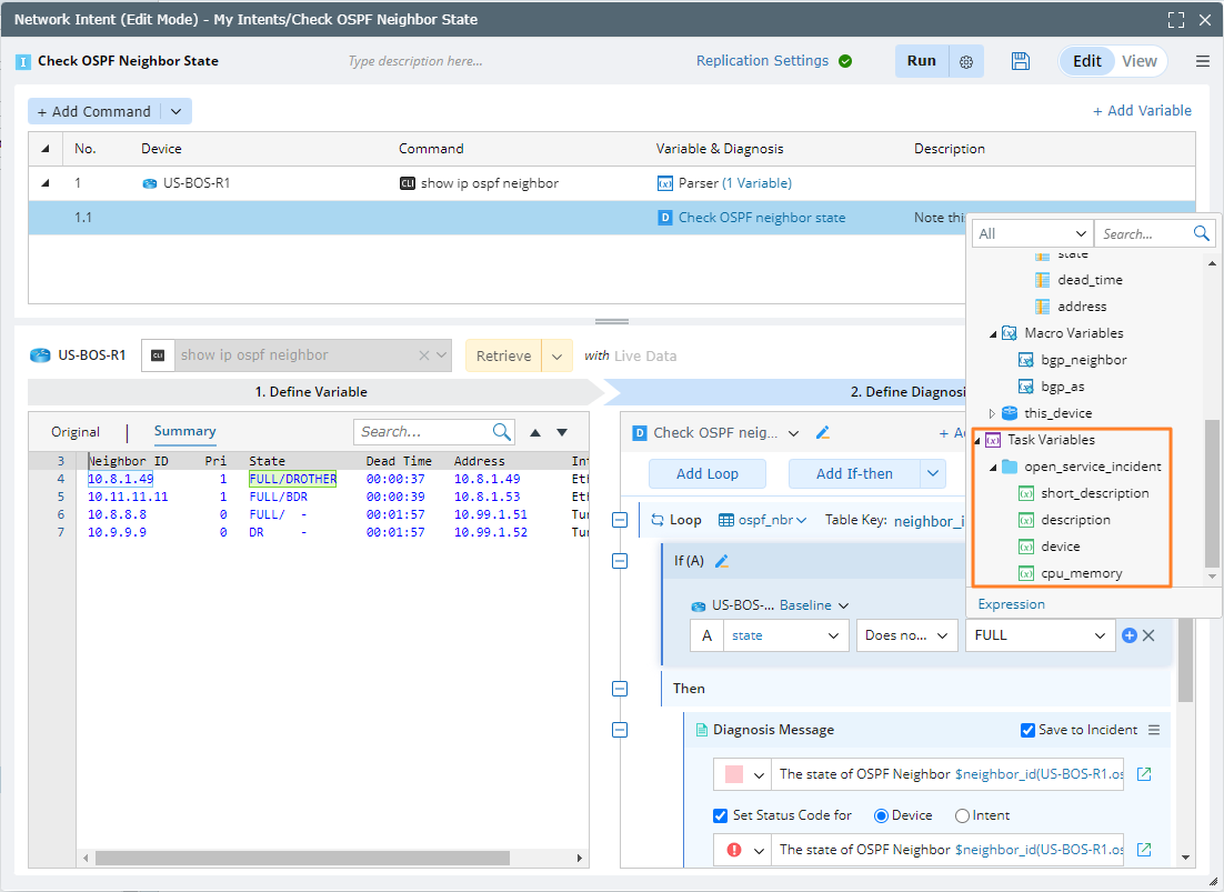 - In the Define Diagnosis tab, the selected task variables are displayed for you to use.
